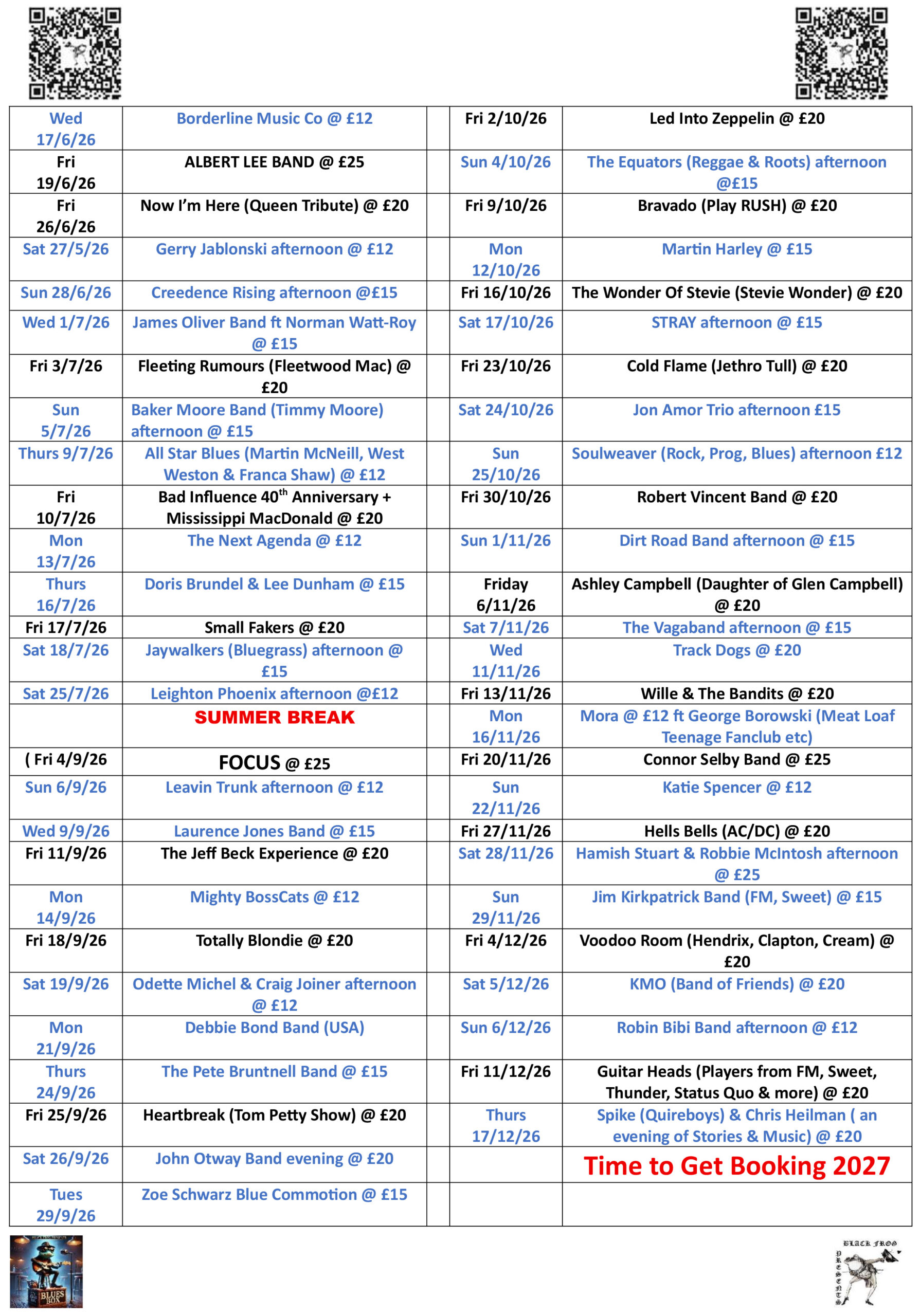 Two ways to book your tickets: you can pre-book shows by calling or texting us at 07508 496411 and then pay by cash or card at the door at the discounted rate without paying any commission. You can also find all our events at https://www.wegottickets.com/BlackFrogPresents or view all our information at www.linktr.ee/BlackFrogPresents