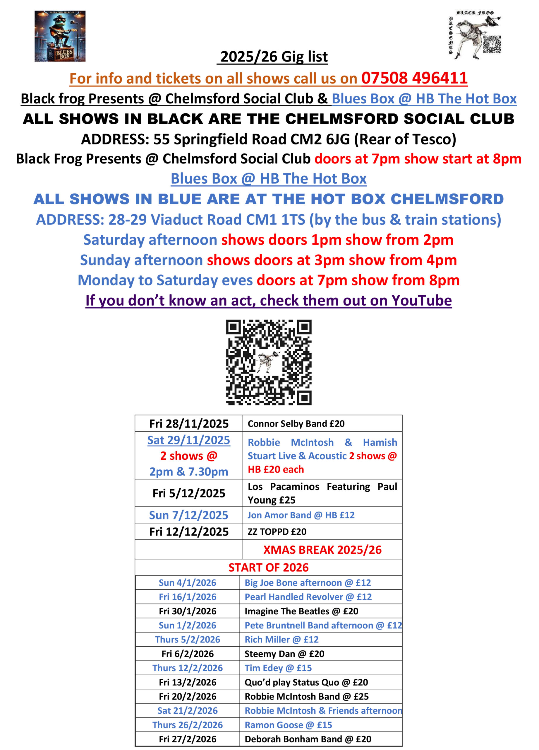 Two ways to book your tickets you can pre-book shows by calling or texting us at 07508 496411 and then pay by cash or card at the door at the discounted rate without paying any commission. You can also find all our events at https://www.wegottickets.com/BlackFrogPresents or view all our information at www.linktr.ee/BlackFrogPresents